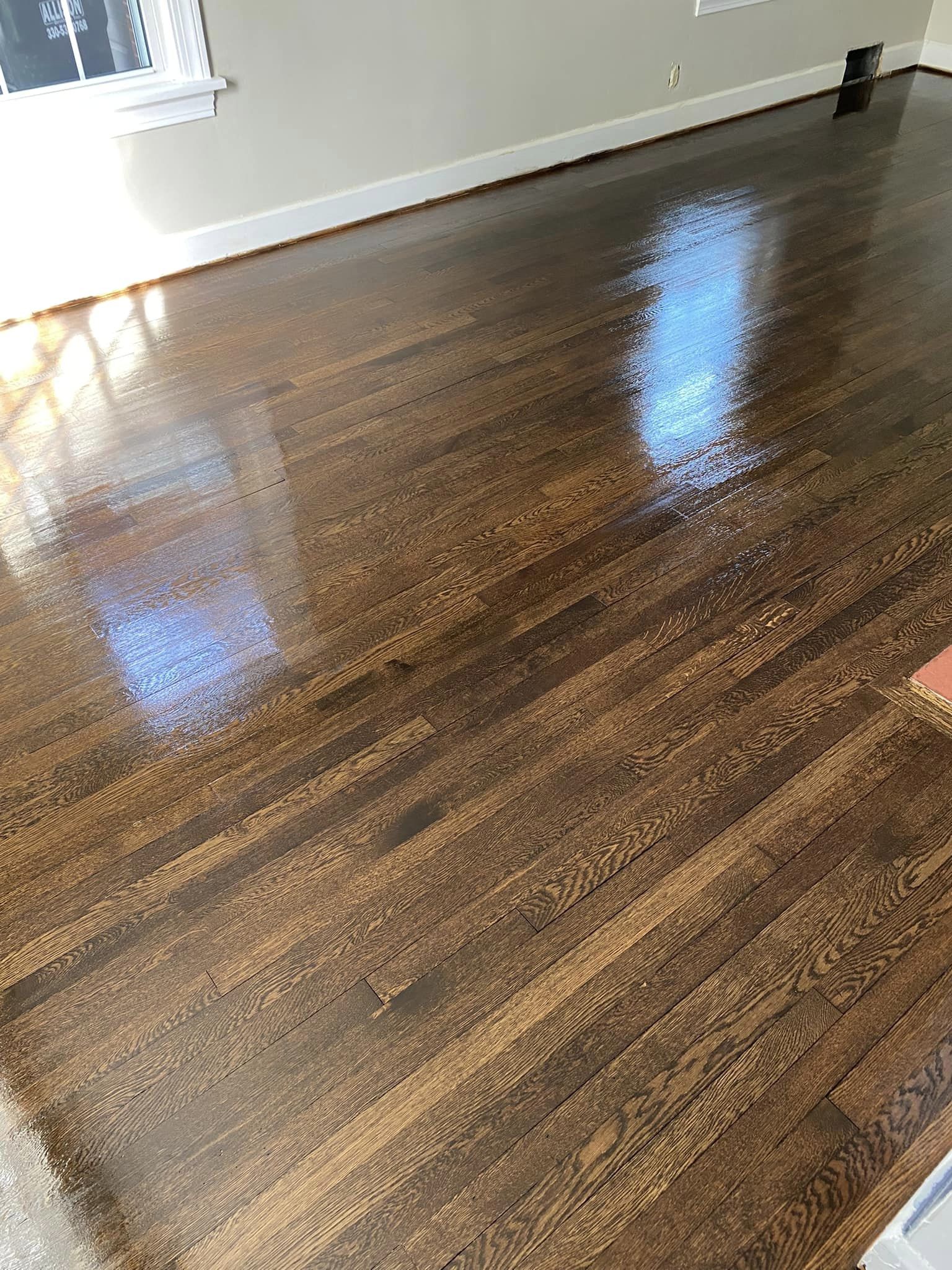 A lot of wear on this floor,but with some awesome sanding and refinishing we stained this red oak floor jacobean with a satan poly.