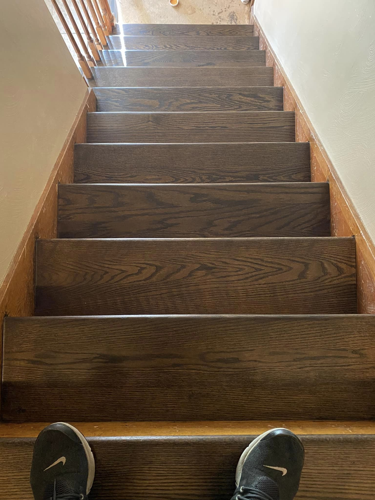 Classic gray duraseal stain on red oak treads. taped off adding 4 coats of poly